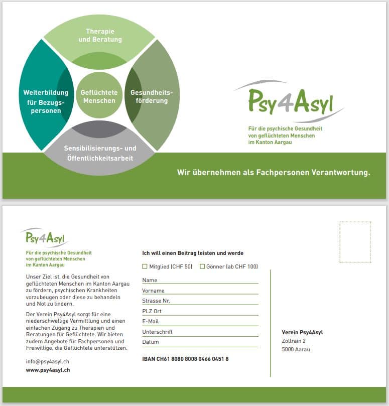 Für den Verein «Psy4Asyl» hat dok-kommunikation einen Flyer für die Mitgliederwerbung gestaltet.