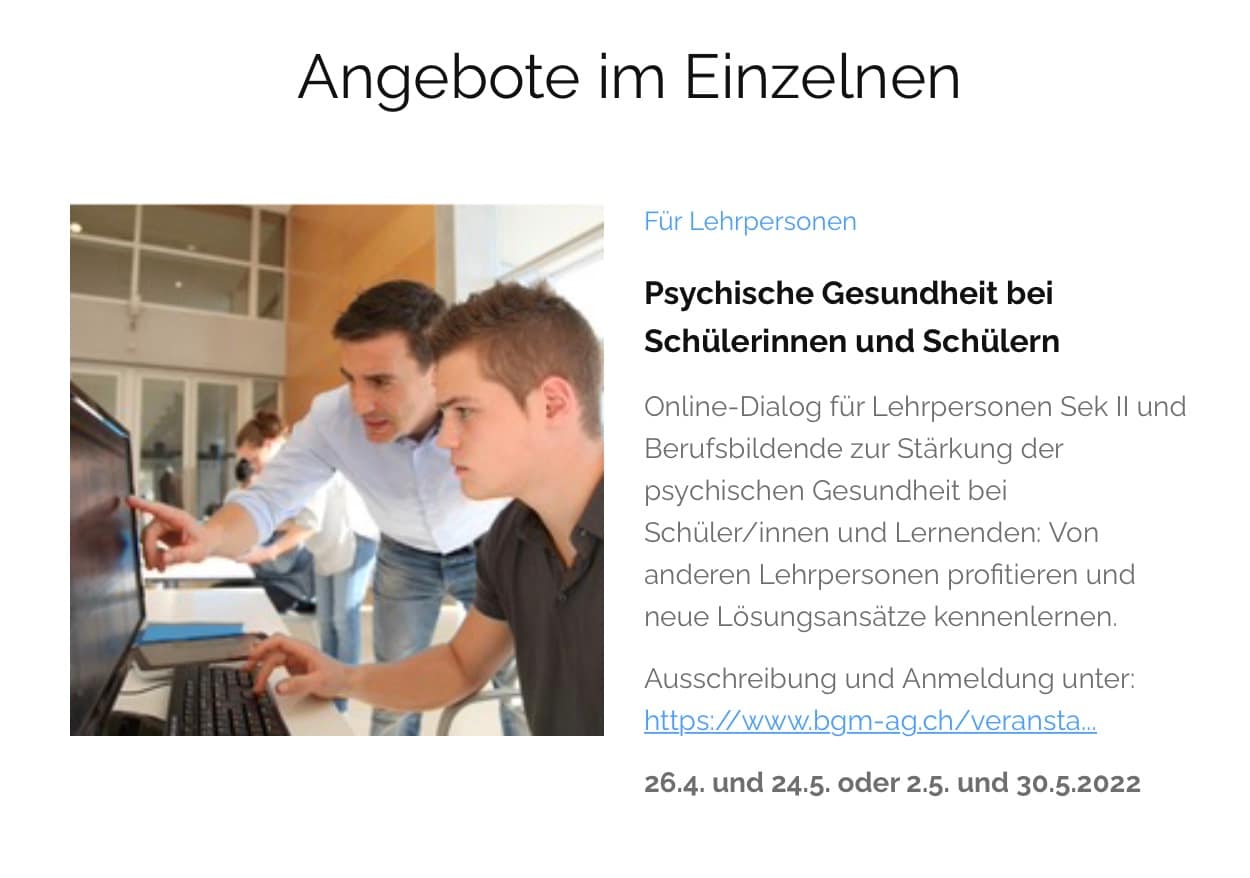 Informativ und «anmächelig» soll es sein – so der Auftrag für ein Schreiben an Rektorate und Lehrpersonen von Berufs- und Mittelschulen im Kanton Aargau. Gesagt – getan und mit guten «Klickraten» belohnt. Ein Dienst für die Psychische Gesundheit von Jugendlichen.
